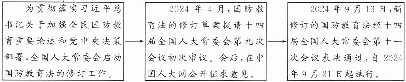 材料 新修订的《中华人民共和国国防教育法》自 2024 年 9 月 21 日起施行。以下是《中华人民共和国国防教育法》修订的简要流程图。