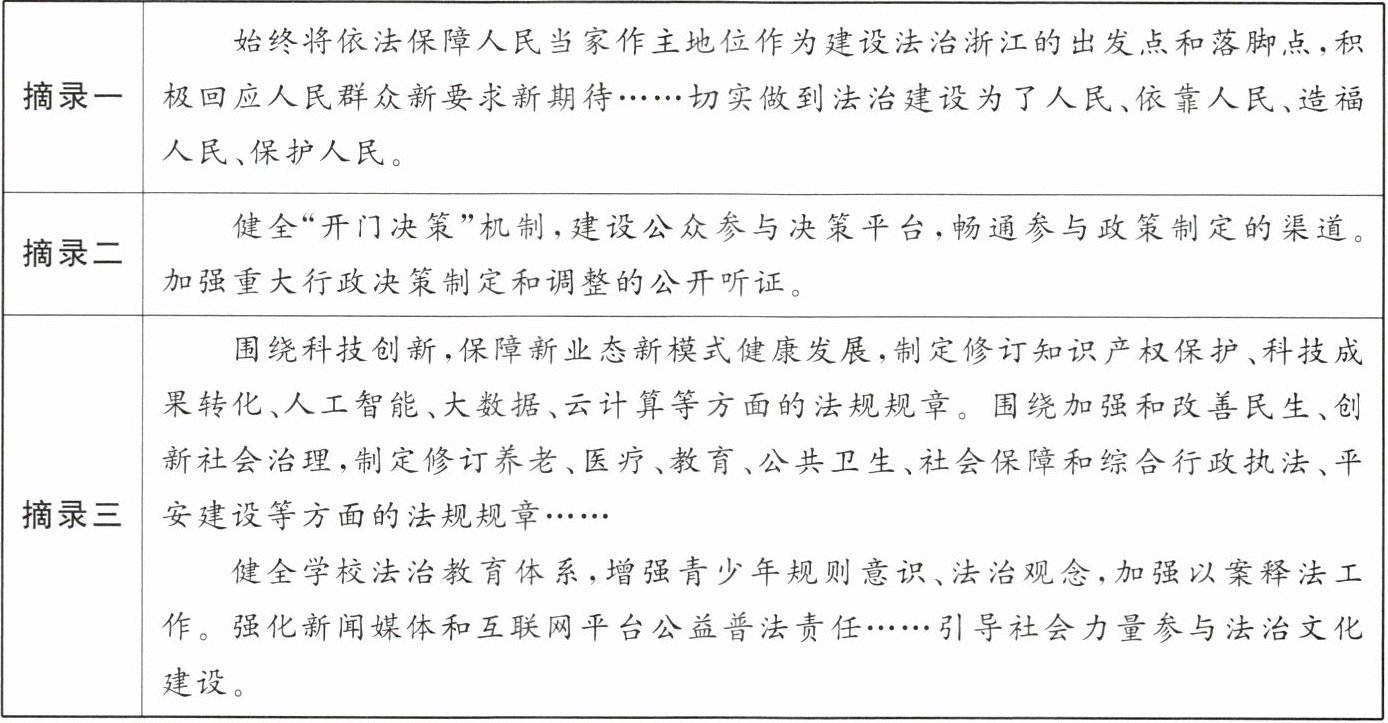 |摘录一|始终将依法保障人民当家作主地位作为建设法治浙江的出发点和落脚点,积极回应人民群众新要求新期待……切实做到法治建设为了人民、依靠人民、造福人民、保护人民。|