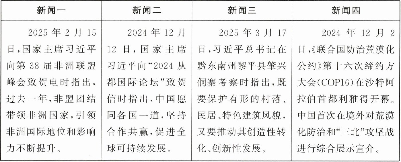 |2025年2月15日,国家主席习近平向第38届非洲联盟峰会致贺电时指出,过去一年,非盟团结带领非洲国家,引领非洲国际地位和影响力不断提升。|2024年12月12日,国家主席习近平向"2024从都国际论坛"致贺信时指出,中国愿同各国一道,坚持合作共赢,促进全球可持续发展。|2025年3月17日,习近平总书记在黔东南州黎平县肇兴侗寨考察时指出,既要保护有形的村落、民居、特色建筑风貌,又要推动其创造性转化、创新性发展。|2024年12月2日,《联合国防治荒漠化公约》第十六次缔约方大会(COP16)在沙特阿拉伯首都利雅得开幕。中国首次在境外对荒漠化防治和"三北"攻坚战进行综合展示宣介。|