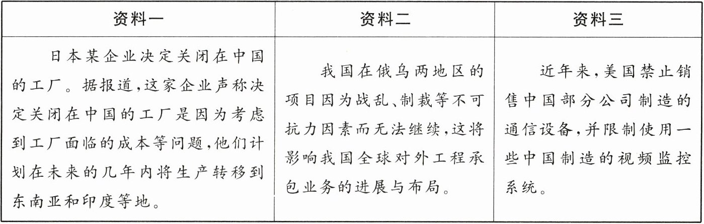 资料三:复杂多变的国际形势,给我国"走出去"发展战略带来各种挑战。