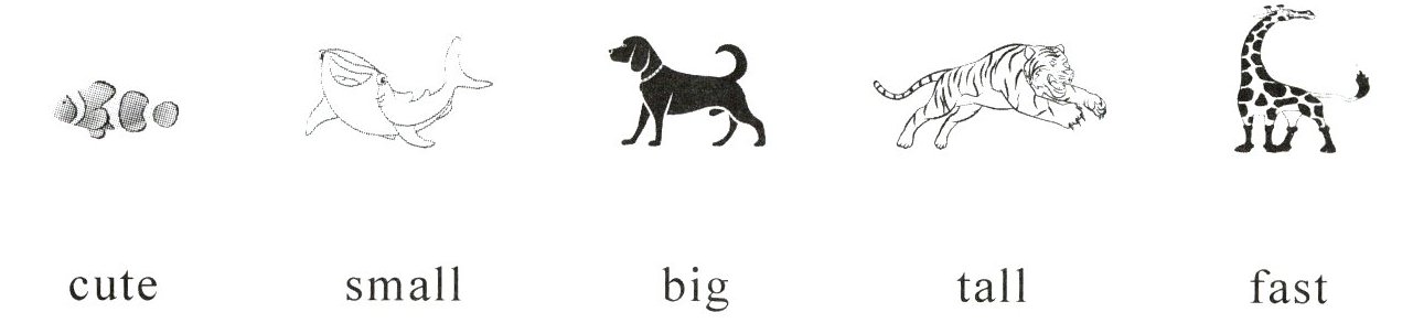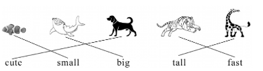 鱼图片—small 鲸鲨图片—big 狗图片—cute 老虎图片—fast 长颈鹿图片—tall