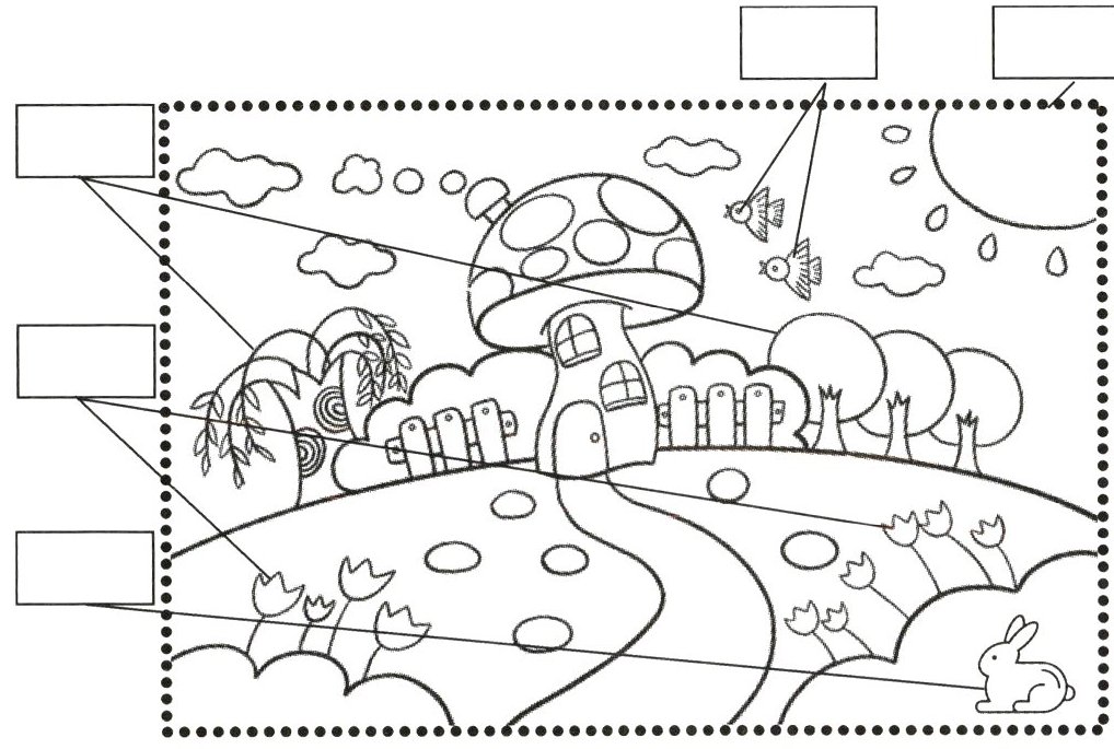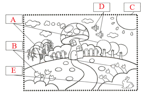 四、Read, look and choose. Li Ming 画了一幅画,画里都有什么呢?请选择正确的单词序号填入方框。