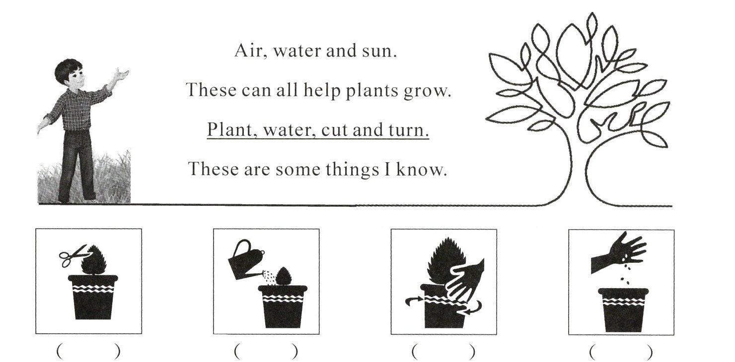 六、Read, look and number. Li Ming 是植物养护小能手,花园里还贴着他编的植物养护歌谣呢!读一读,让我们根据歌谣把下面四幅图片排一排顺序。