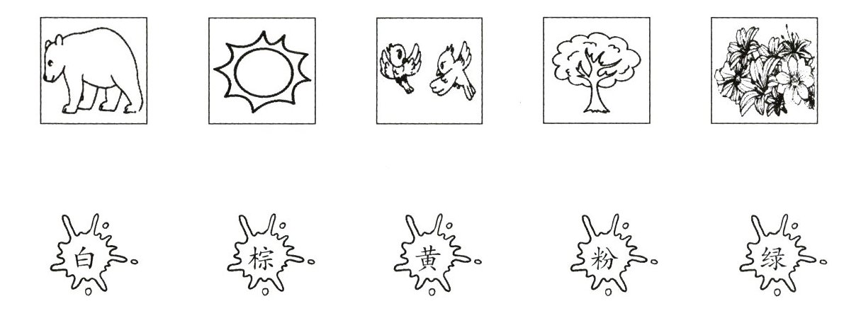 从左到右依次连线为:熊和棕色;太阳和黄色;鸟和白色;树和绿色;花和粉色。