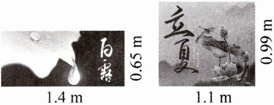 4.白露展板:1.4×0.65=0.91($m^2$) 立夏展板:1.1×0.99=1.089($m^2$) 0.91<1.089 1.089-0.91=0.179($m^2$) 答:立夏展板玻璃的面积大,大0.179$m^2$。