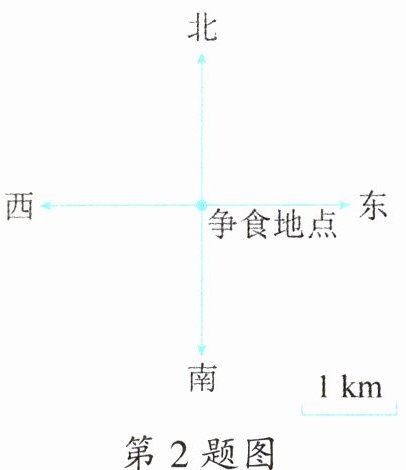 2. 非洲草原上,一只猎豹和一头狮子在争食。突然,它们受到了惊吓,猎豹以每分钟 $2km$ 的速度向西偏南 $30^{\circ}$ 方向奔跑,狮子以每分钟 $1km$ 的速度向东偏北 $40^{\circ}$ 方向奔跑,请你在图中标出 $2min$ 后它们各自的位置。