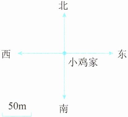 图略 解析:小兔家到小鸡家图上距离:$200÷50=4$个单位长度。以小鸡家为观测点,在东偏北$30^{\circ }$方向画4个单位长度,即可得小兔家的图上位置。同样方法,小松鼠家到小兔家距离:$150÷50=3$个单位长度。以小兔家为观测点,在南偏东$40^{\circ }$方向画3个单位长度,即可得小松鼠家的图上位置。