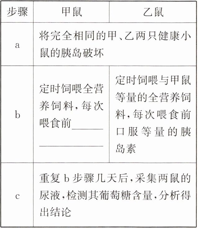 |b|定时饲喂全营养饲料,每次喂食前______|定时饲喂与甲鼠等量的全营养饲料,每次喂食前口服等量的胰岛素|