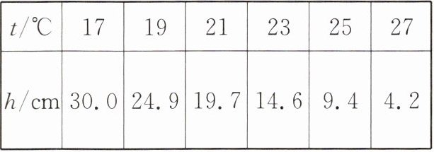 (2)①玻璃泡 ②分析表中数据能看出,温度每升高$2°C$,其液柱大约会下降5cm,在$27°C$时的液柱总长只有4.2cm,即小于5cm,故该温度计不能测出$29°C$及其以上的温度