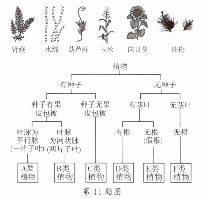 11. 认真观察和识别下图中的植物,并阅读下图的分类表,回答问题: