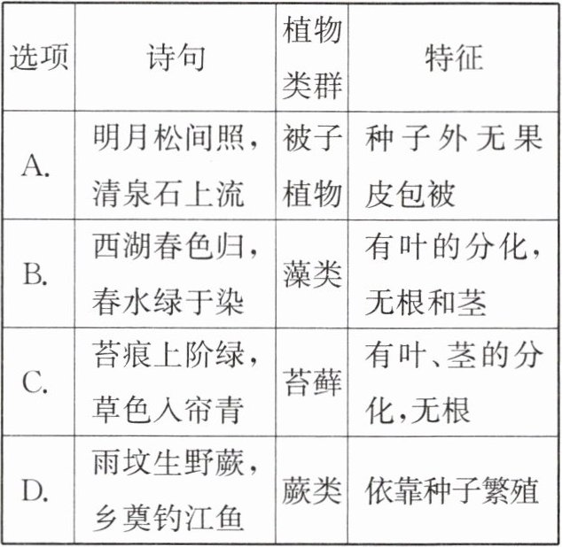 7. 下列诗句中描述的植物所属的植物类群和特征相符的是(
