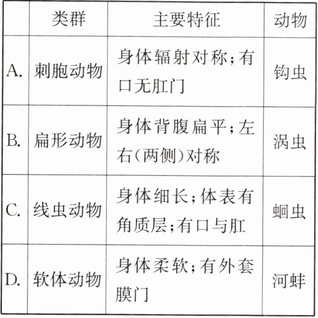 |A. 刺胞动物|身体辐射对称;有口无肛门|钩虫|