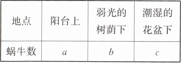 )。(3)为了进一步了解蜗牛的生存环境,小科调查并记录了各处环境中蜗牛的数量,如表所示。