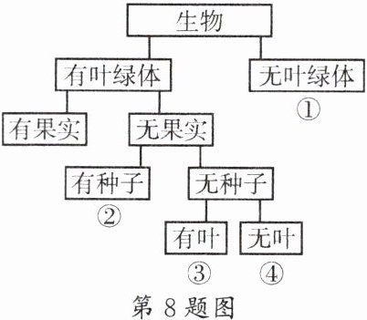 8. 如图是某同学建立的生物分类图,其中①~④各代表一种生物。下列不能用该图分类的一组生物是(