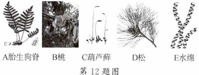 12. 如图为五种植物及其分类简图,请先将分类简图补充完成,图中a处应填写上