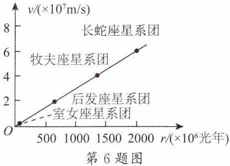 6. 天文学家哈勃观察到,星系在远离我们而去。哈勃研究了24个距离已知的星系,得出它们退行的速度v与它们离地球的距离r的关系(如图)。根据哈勃的观察和宇宙大爆炸理论,下列关于图中四个星系团的说法,正确的是(