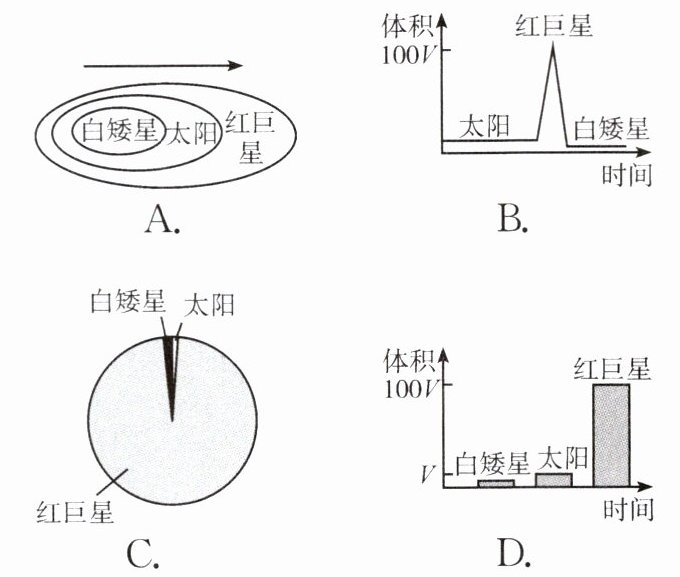 8. 在认识世界时,我们经常用各种方法来形象、直观地表示事物或者规律。下列关于太阳一生的体积变化规律最为合理的图像是(