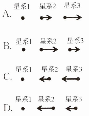 (2)科学家观察发现宇宙处于不断膨胀中,所有的星系都在远离我们而去,离我们越远的星系,退行越快。若从我们所在的星系1观测,如图能类比宇宙膨胀的是(箭头方向和长短分别表示运动方向和快慢)