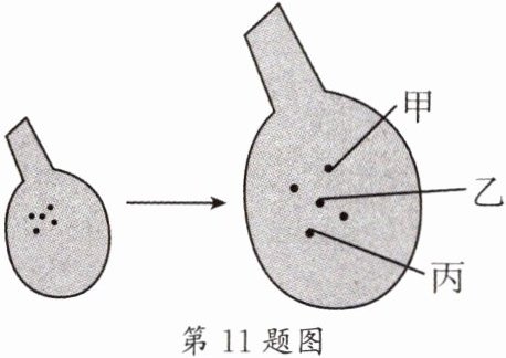 11. 宇宙大爆炸理论认为,宇宙一开始是一个“原始火球”,原始的火球发生了大爆炸,导致宇宙空间处处膨胀,温度下降到一定程度时,逐步形成了超星系团、星系团、星系乃至恒星和行星等。科学兴趣小组利用气球做星系运动特点的模拟实验,如图。