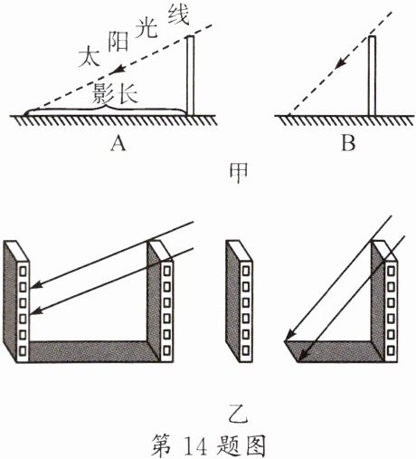 14. 如图甲是小明同学测绘的学校操场上旗杆影子长度(分别在夏季和冬季某日的12时测得)。