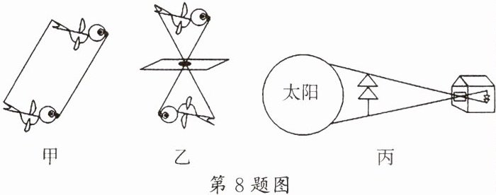 8. 沈括在《梦溪笔谈》中写道:“若鸢飞空中,其影随鸢而移;或中间为窗隙所束,则影与鸢遂相违:鸢东则影西,鸢西则影东;又如窗隙中楼塔之影,为窗所束亦皆倒……”。文中描写的情景分别对应如图的甲、乙、丙,则下列说法正确的是(