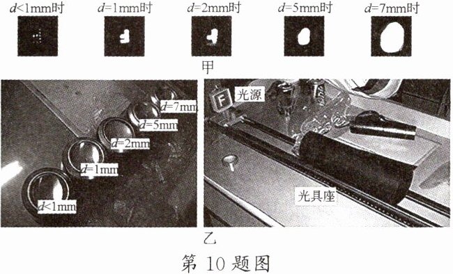 10. 一组同学进行“小孔成像”的实验探究,在每个易拉罐的底部钻出大小不同的孔($d$表示小孔直径),制作了5个小孔成像仪器,将光源和小孔成像仪器固定在光具座上,保持光源与小孔的距离不变,用5个小孔成像仪器分别观测,得到的像如图甲所示,请你根据他们的实验过程和现象回答问题: