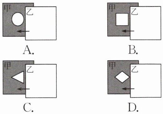 11. 在探究树荫下光斑的综合实践活动中,为了研究孔的大小对光斑形状的影响,小华设计了四种开有不同形状孔的卡片甲,并用另一张卡片乙覆盖在甲上,如图所示。接着,从图示位置沿箭头方向水平移动乙,观察光斑形状的变化情况。下列合乎要求的是(