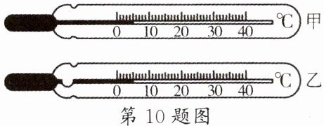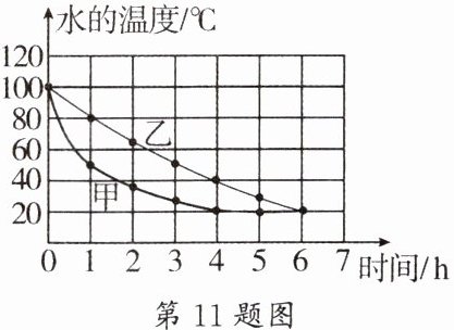 11. 甲、乙是两个不同品牌的保温杯,为了比较这两个保温杯盛水时的保温效果,小明按照科学探究的程序,在室内进行了实验,得到了一段时间内甲、乙两个保温杯内水的温度的实验数据,根据数据绘制的图像如图所示,请你根据图像提供的信息回答以下问题: