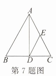 7. 如图,$\triangle ABC$中,$AB = AC = 15$,$AD$平分$\angle BAC$,点$E$为$AC$的中点,连结$DE$。若$\triangle CDE$的周长为$24$,则$BC$的长为(
