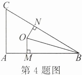4. 如图所示,点 $O$ 在一块直角三角板 $ABC$ 上(其中 $\angle ABC = 30^{\circ}$),$OM\perp AB$ 于点 $M$,$ON\perp BC$ 于点 $N$。若 $OM = ON$,则 $\angle ABO=$