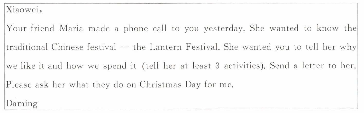 假如你是小伟,你的室友大明昨天接到你朋友 Maria 的电话。Maria 说她正在研究中国的传统节日,需要你的帮助。现在,请你根据大明所留的便条内容,给 Maria 写一封回信。
