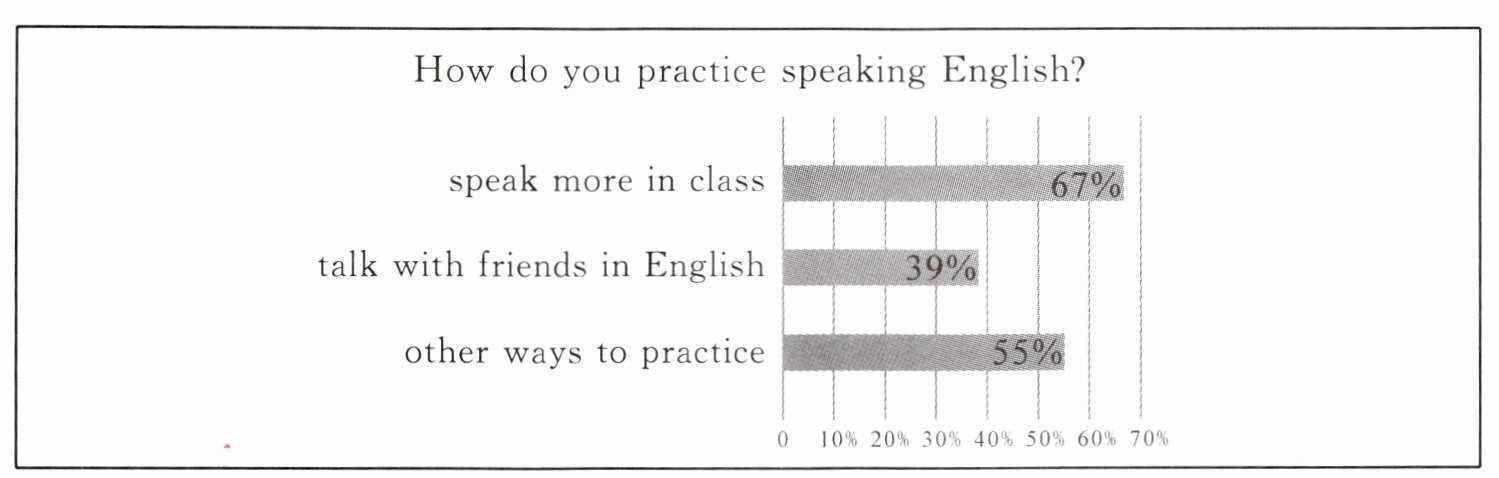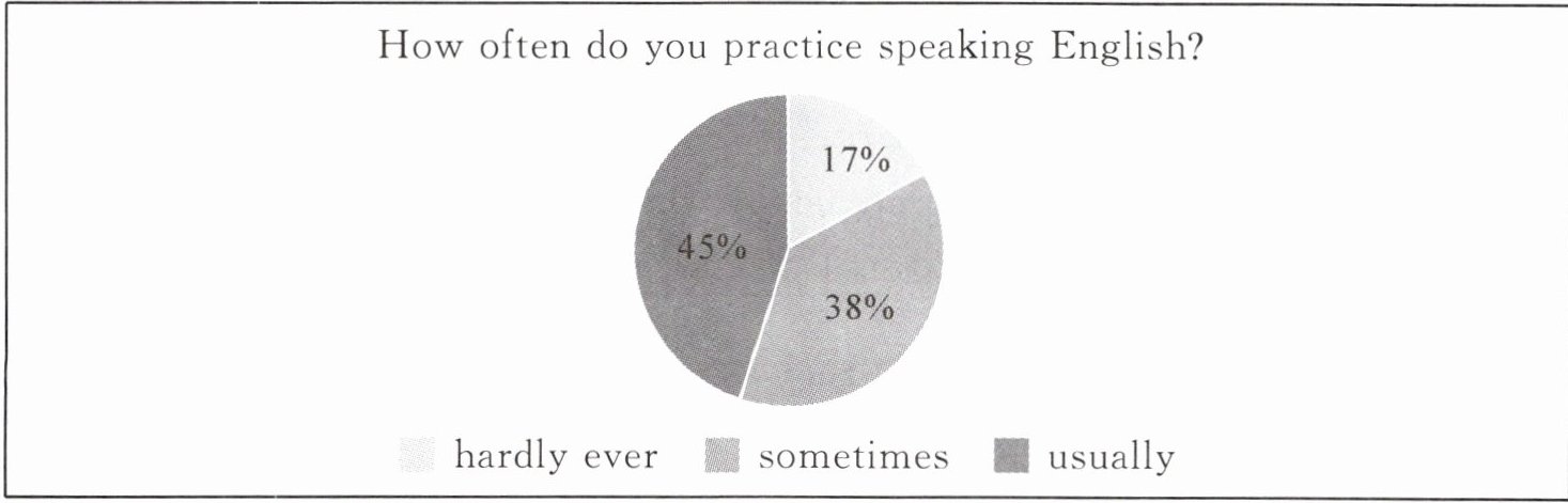 From the survey, we can see that most students know the importance of spoken English and are willing to practice. The school should create more chances for them, such as the English speech competition and the English singing competition. Also, students can create chances by themselves, like taking part in the English corner and making some foreign friends online.