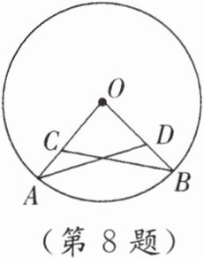 8. 如图,已知 $ OA $,$ OB $ 是 $ \odot O $ 的两条半径,$ C $,$ D $ 为 $ OA $,$ OB $ 上的两点,且 $ AC = BD $。求证:$ AD = BC $。