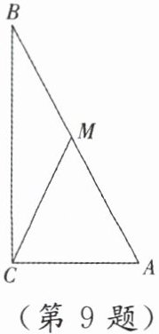 9. 如图,在 $ \triangle ABC $ 中,$ \angle ACB = 90^{\circ} $,$ AC = 2 cm $,$ BC = 4 cm $,$ CM $ 是中线,以点 $ C $ 为圆心,$ \sqrt{5} cm $ 为半径画圆,则点 $ A $,$ B $,$ M $ 与 $ \odot C $ 的位置关系如何?