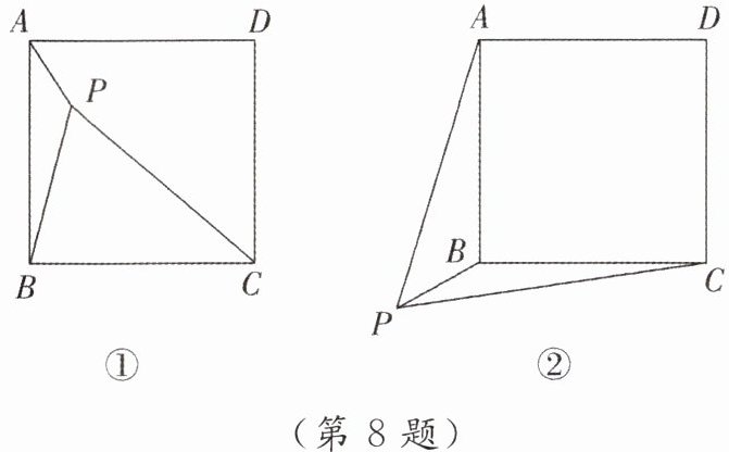 8. 【问题解决】在一节数学课上,老师提出了这样一个问题:如图①,P是正方形ABCD内一点,PA = 1,PB = 2,PC = 3,你能求出∠APB的度数吗?