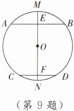 9. 如图,在⊙O中,AB,CD为两条弦,且AB//CD,直径MN经过AB的中点E,交CD于点F. 求证: