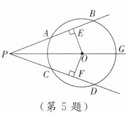 5. 如图,$PO$是直径所在的直线,且$PO平分\angle BPD$,$OE\perp AB$,$OF\perp CD$. 有下列说法:①$AB = CD$;②$\overset{\LARGE{\frown}}{AB}= \overset{\LARGE{\frown}}{CD}$;③$PO = PE$;④$\overset{\LARGE{\frown}}{BG}= \overset{\LARGE{\frown}}{DG}$;⑤$PB = PD$. 其中正确的是