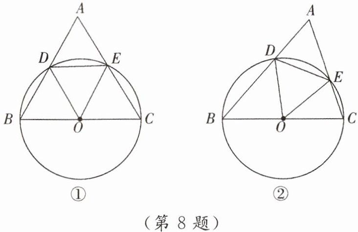 8. [教材P86例4改编]如图,以$\triangle ABC的边BC为直径的\odot O分别交AB$,$AC于D$,$E$两点,连结$OD$,$OE$,$DE$.