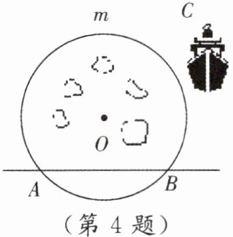 4. [教材P92例3改编]如图,$A$,$B$是两座灯塔,在弓形$AmB$内有暗礁,军舰$C$在附近海面游弋,且$\angle AOB = 80^{\circ}$,要使军舰$C$不驶入暗礁区,则航行中应保持$\angle ACB$(