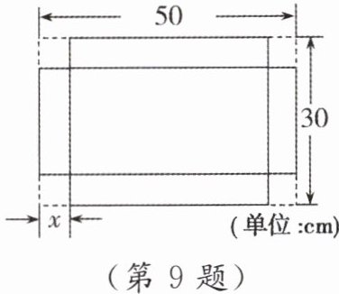 9. [教材 P4 合作学习(3)改编]如图,有一张长 $ 50\ cm $、宽 $ 30\ cm $ 的矩形纸板,截去角上四个相同的小正方形后,折成一个无盖纸盒. 设纸盒的底面积为 $ y(cm^{2}) $,高为 $ x(cm) $,则 $ y $ 与 $ x $ 之间的函数表达式为