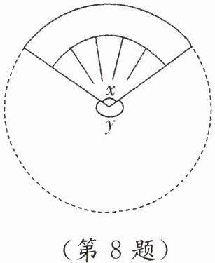 8. 如图,扇子的圆心角为 $ x $,余下扇形的圆心角为 $ y $,$ x $ 与 $ y $ 的比通常按黄金比来设计,这样的扇子外形比较美观. 若黄金比取 $ 0.618 $,则 $ x $ 约为(