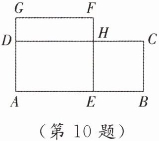10. [原创]如图,在矩形 $ ABCD $ 中,$ AB>BC $,在 $ AB $ 上取一点 $ E $,作正方形 $ AEFG $,$ EF $ 与 $ CD $ 相交于点 $ H $. 若 $ S_{\mathrm{正方形}AEFG} = S_{\mathrm{矩形}ABCD} = 4 $,四边形 $ BCHE $ 是正方形,求证:$ H $ 是 $ EF $ 的黄金分割点.