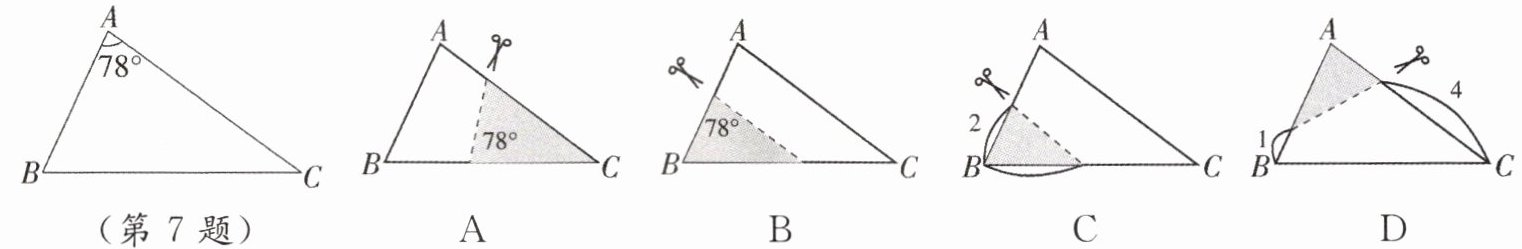 7. 如图,在 $\triangle ABC$ 中,$\angle A = 78°$,$AB = 4$,$AC = 6$. 将 $\triangle ABC$ 沿图示中的虚线剪开,剪下的阴影三角形与原来三角形不相似的是(