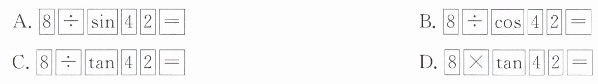 2. 如图,在 $ \triangle ABC $ 中, $ \angle C = 90^{\circ} $, $ \angle B = 42^{\circ} $, $ BC = 8 $. 若用科学计算器求 $ AC $ 的长,则下列按键顺序中,正确的是(
