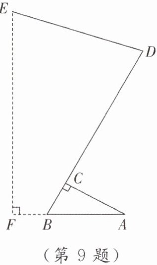 9. 一种可折叠的器械放置在水平地面上,这种器械的侧面结构如图所示, $ \triangle ABC $ 为底座,点 $ B $, $ C $, $ D $ 在同一条直线上,已知 $ \angle ACB = 90^{\circ} $, $ \angle ABC = 55^{\circ} $, $ AB = 30cm $, $ \angle BDE = 70^{\circ} $,其中一段支撑杆 $ CD = 80cm $,另一段支撑杆 $ DE = 70cm $. 求支撑杆上的点 $ E $ 到水平地面的距离 $ EF $ (精确到 $ 1cm $ ).