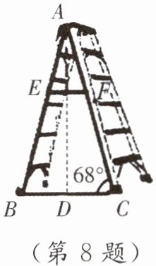 8. 如图,已知“人字梯”的 $ 5 $ 个踩档把梯子等分成 $ 6 $ 份,从上往下的第二个踩档与第三个踩档的正中间处有一条 $ 60cm $ 的绑绳 $ EF $,当绑绳 $ EF $ 成一条直线时,梯子一侧与地面的夹角为 $ 68^{\circ} $,则此时“人字梯”的顶端离地面的高度 $ AD $ 为