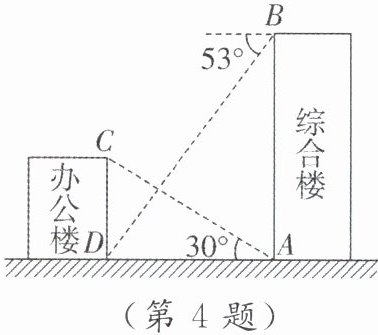 4. 在一次数学课外实践活动中,小明所在的学习小组从如图所示的综合楼顶部B处测得办公楼底部D处的俯角是53°,从综合楼底部A处测得办公楼顶部C处的仰角是30°. 已知综合楼高24m,求办公楼的高度(精确到0.1m;参考数据:$\tan37°\approx0.75$,$\tan53°\approx1.33$,$\sqrt{3}\approx1.73$).