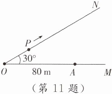 11. 如图,有两条公路$OM$,$ON相交成30^{\circ}$角,沿公路$OM方向离O点80\mathrm{m}处有一所学校A$,当重型运输卡车$P沿道路ON$方向行驶时,在以点$P$为圆心,$50\mathrm{m}$为半径的圆形区域内都会受到卡车噪声的影响,且卡车$P与学校A$的距离越近噪声影响越大,已知重型运输卡车$P沿道路ON方向行驶的速度为18\mathrm{km/h}$.