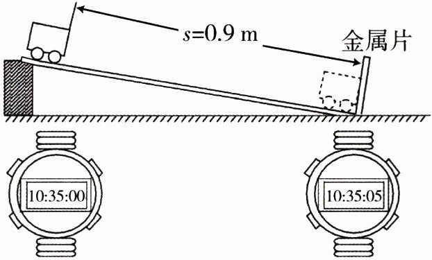 8. 下图是小峰测小车运动的平均速度的实验过程,根据图中所记录的时间及测量的距离,可知小车通过全程的平均速度是______ $ m/s $。第一次测量结束后,小峰把支撑斜面的木块在原位置由竖放改为横放,又进行了第二次测量,测量结果______(填“大于”“等于”或“小于”)第一次测量结果。