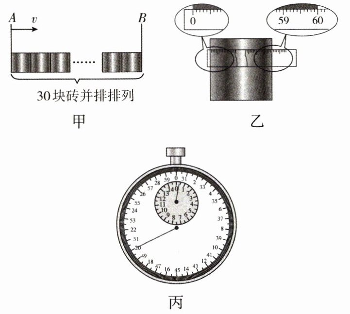 cm。(2)小林用秒表测量自己从长廊的 $ A $ 端走到 $ B $ 端所用的时间,秒表的示数如图丙所示,他所用的时间是